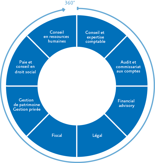 Accompagnement et conseil dans votre gestion courante et dans vos moments clefs. Nos expertises et nos services spécialisés garantissent une réactivité et une technicité de haut niveau. Notre équipe est composée d’experts-comptables, de fiscalistes, d’avocats, de consultantes en droit social et de gestionnaires de paie couvrant ainsi les compétences nécessaires à un accompagnement 360° de proximité.